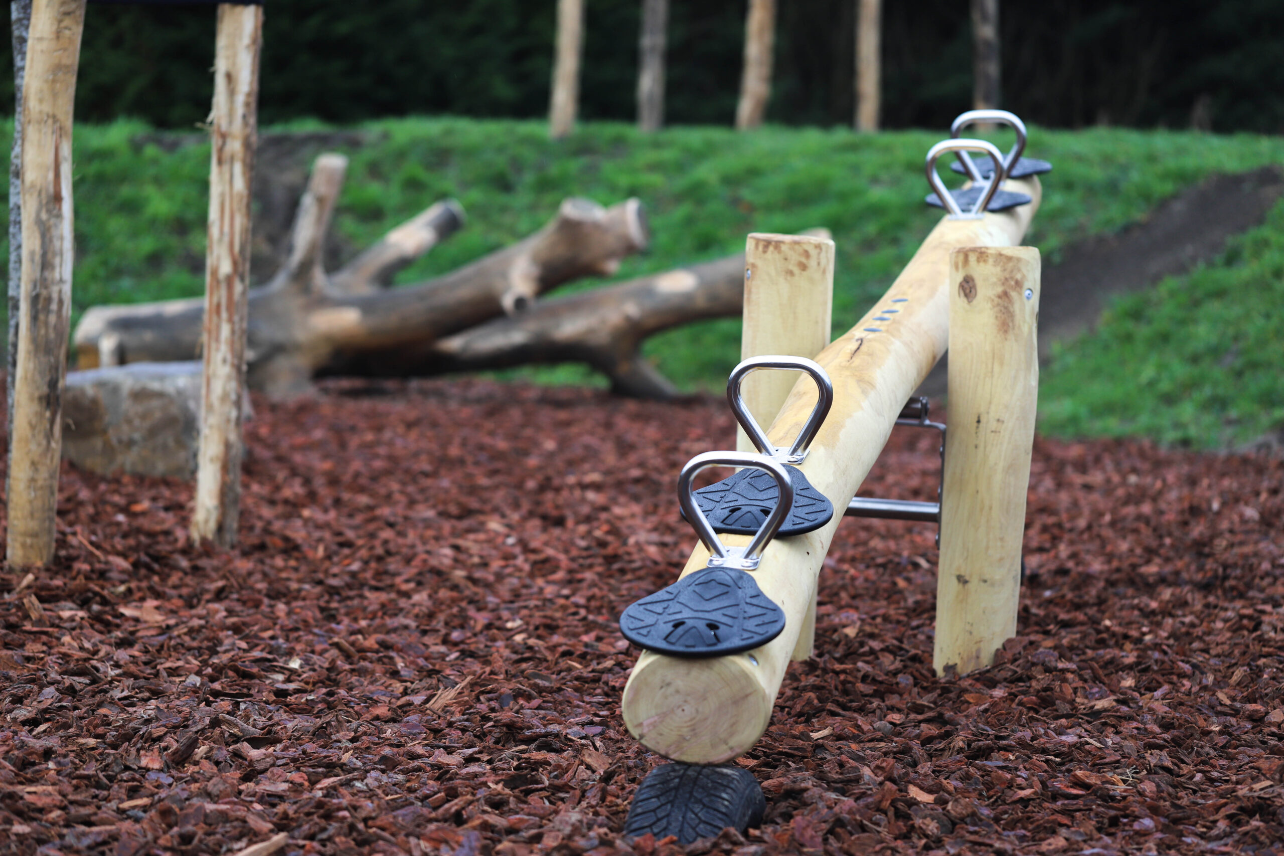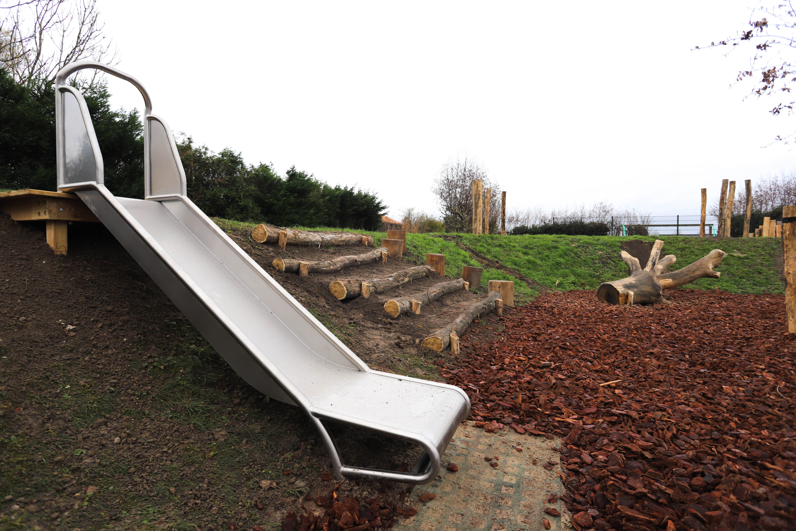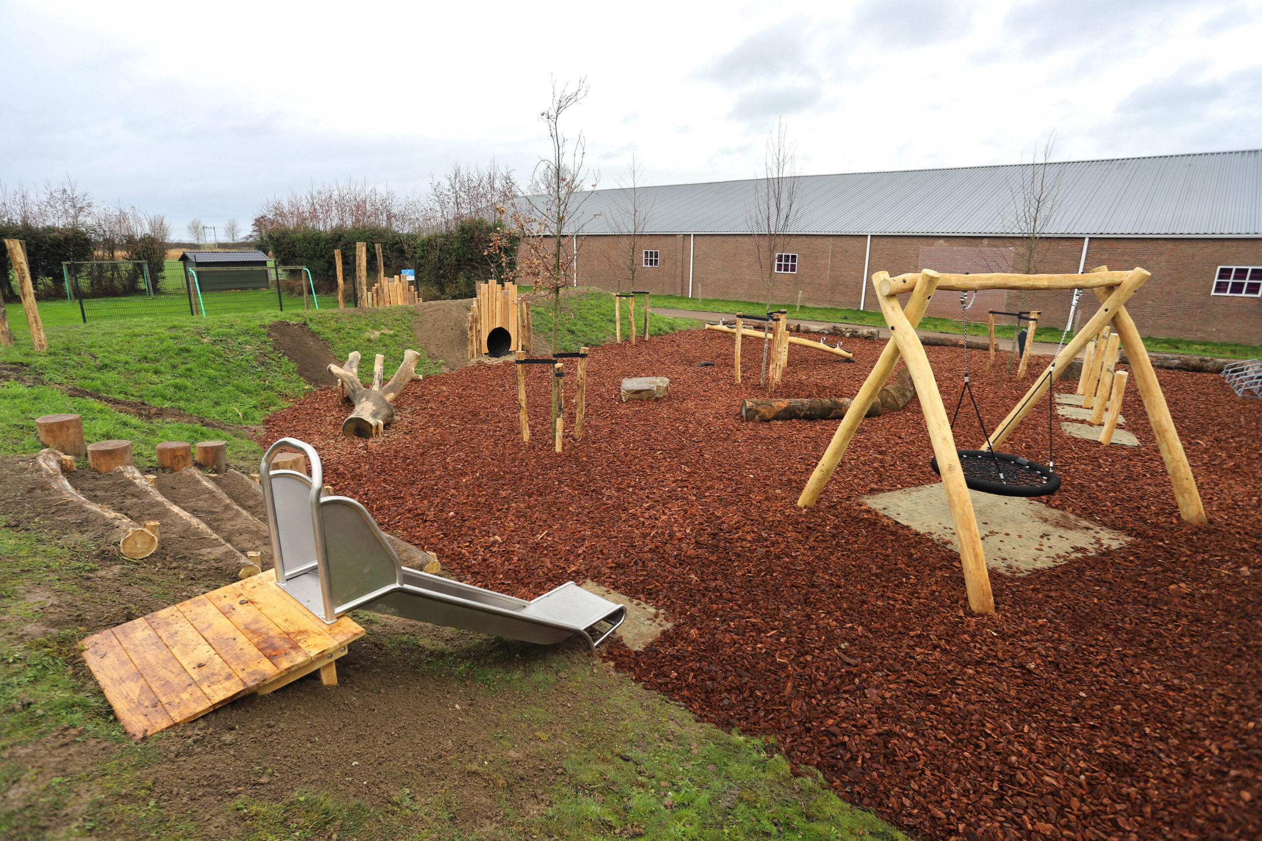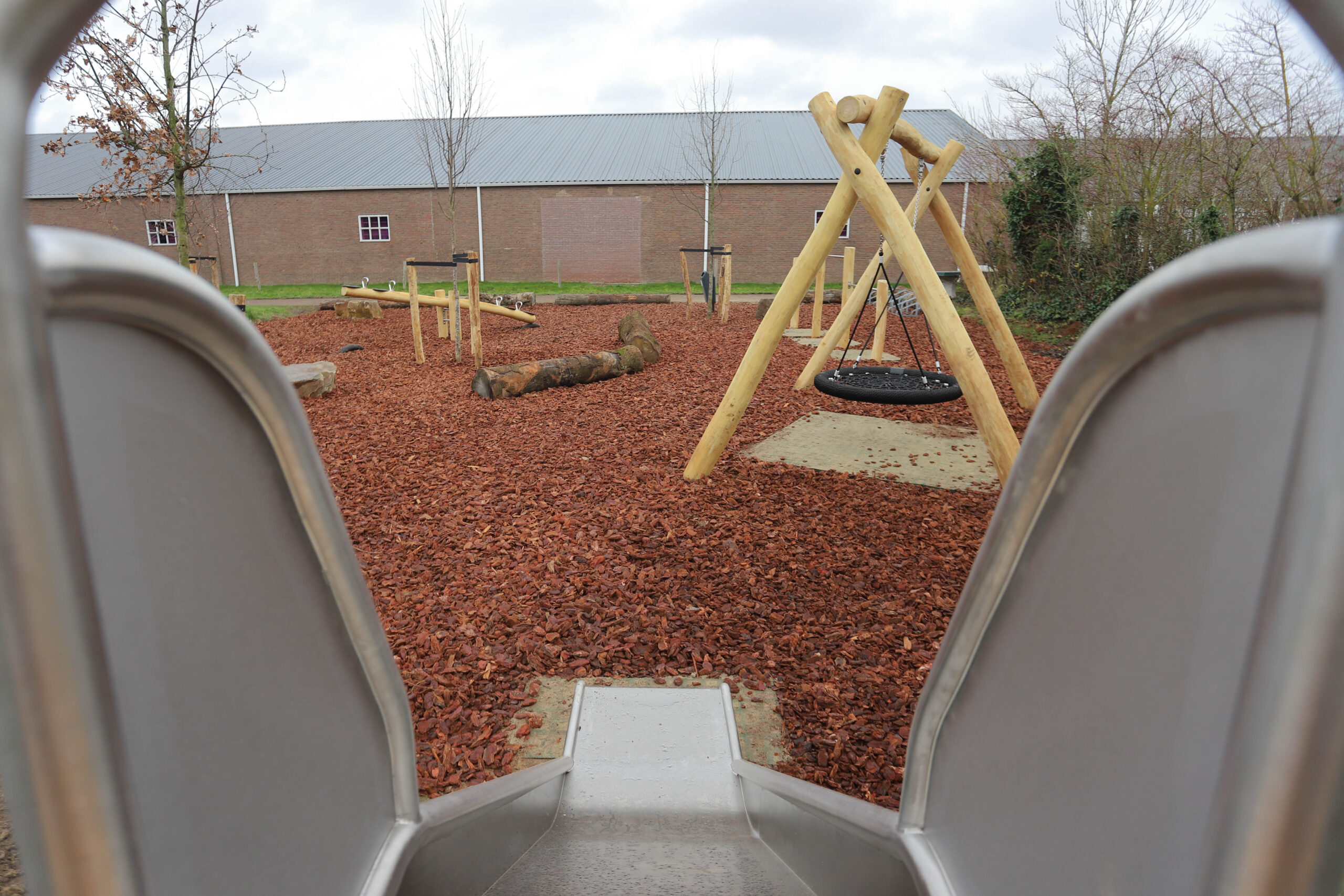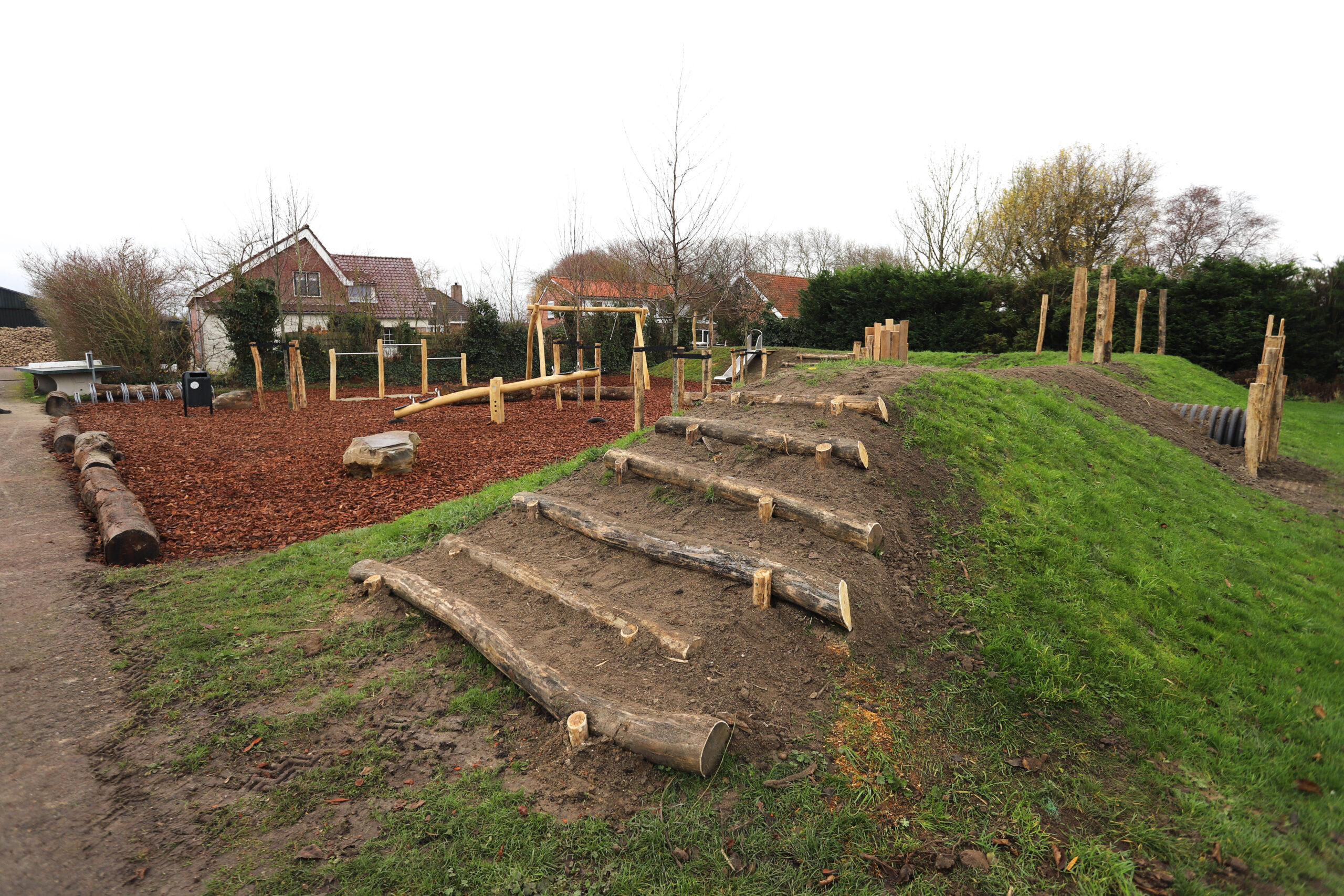 Voor een natuurlijke uitstraling zijn stamhout en keien toegevoegd waarop ook gespeeld kan worden, en hebben we vier bomen geplant. Die zorgen niet alleen voor sfeer, maar vooral voor fijne schaduwplekken tijdens het spelen. Op het talud zijn twee trappen aangelegd en de speelplaats kreeg een nieuwe laag boomschors.